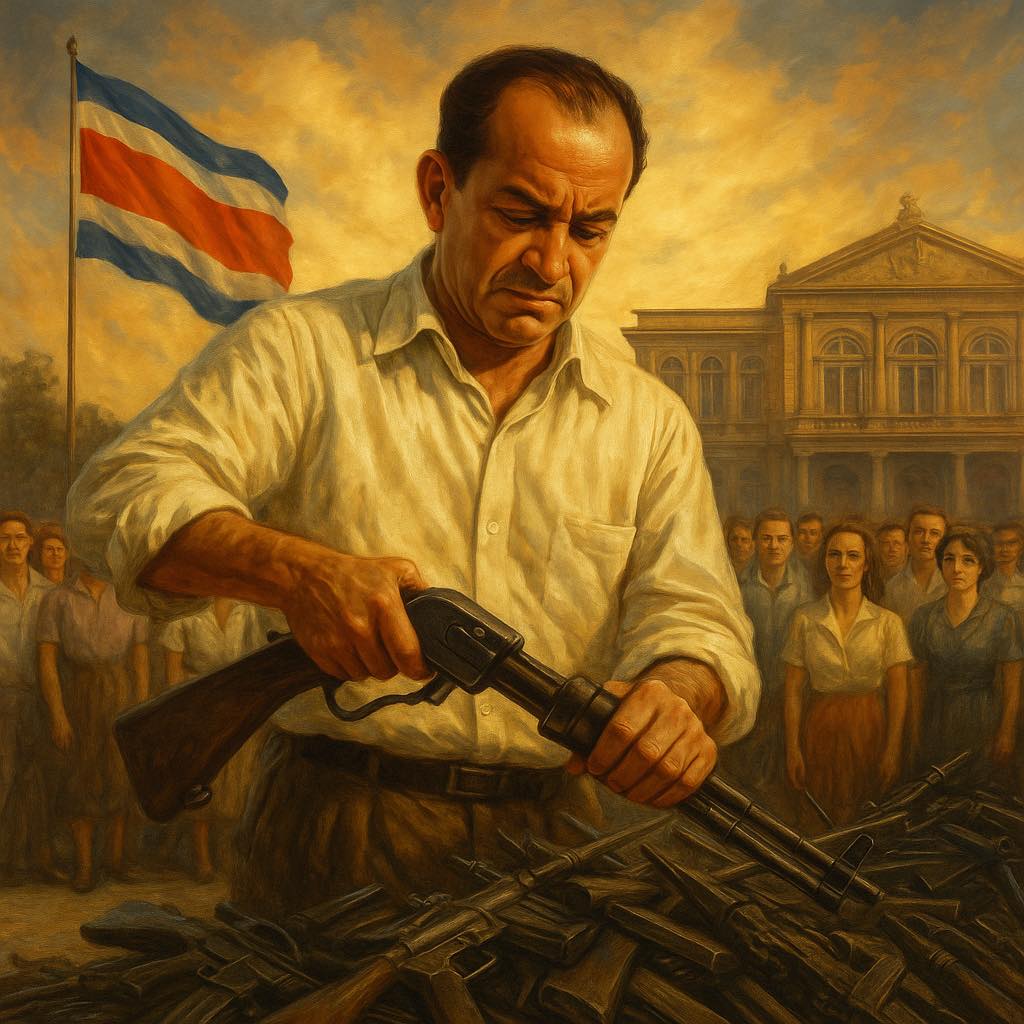 Un primero de diciembre de 1948, don Pepe Figueres tomó una decisión que no solo fue valiente… fue visionaria. Abolir el ejército para que nunca más nadie pudiera tomar el poder por la fuerza desde adentro. Para que nunca más un hombre armado decidiera el destino de millones. Para que esta patria se defendiera con votos, no con balas.