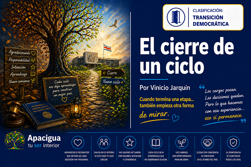 Estamos prontos a cambiar a los diputados de la Asamblea Legislativa, aquellos que elegimos democráticamente hace cuatro años, por otros que, de una forma similar, hemos elegido para que nos representen en el siguiente período. Es un momento que, más allá del movimiento político, tiene algo profundamente humano: el cierre de un ciclo. Un espacio donde termina una etapa y comienza otra, donde las decisiones, los aciertos, los errores y las intenciones quedan atrás como parte de un proceso que, nos guste o no, define el rumbo del país.