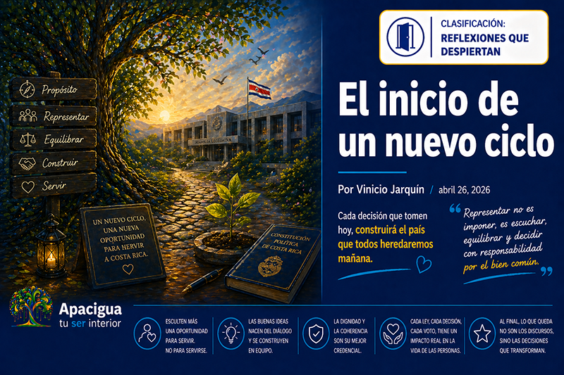 Desde Apacigua tu ser interior, el deseo es simple, pero profundo. Que su paso por la Asamblea Legislativa esté marcado por la dignidad. Que el ejercicio del poder no los aleje de sus valores, sino que los ponga a prueba y los fortalezca. Que puedan sostener una línea interna clara, incluso cuando el entorno invite a desviarse. Que recuerden, en medio de la dinámica política, que representar no es imponer, sino escuchar, equilibrar y decidir con responsabilidad.
