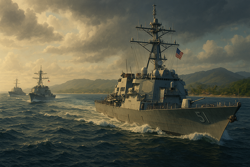 En el límite difuso donde el azul del océano se confunde con el del cielo, aparecieron siluetas gigantes. No eran barcos de pesca ni cruceros de placer: eran colosos grises, afilados, con antenas y torretas que parecían vigías de otro mundo. El primero en ser avistado fue el USS Gravely, avanzando con la parsimonia de un depredador que no tiene prisa. A su costado, el USS Jason Dunham y el USS Sampson cortaban las olas con precisión quirúrgica.