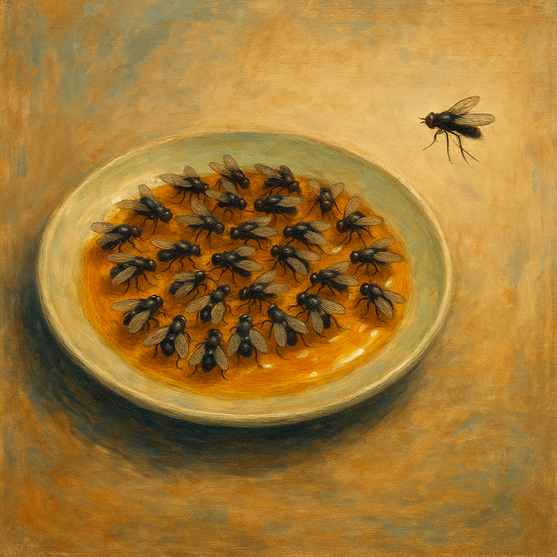 Había una vez un plato con miel. Brillaba al sol, dulce, irresistible. Poco a poco comenzaron a llegar las moscas. Una, dos, tres… decenas. Se posaban sobre la miel, atraídas por su olor y su brillo, y una a una quedaban atrapadas. Al principio agitaban las alas, intentando liberarse, pero la miel las sujetaba con suavidad mortal.