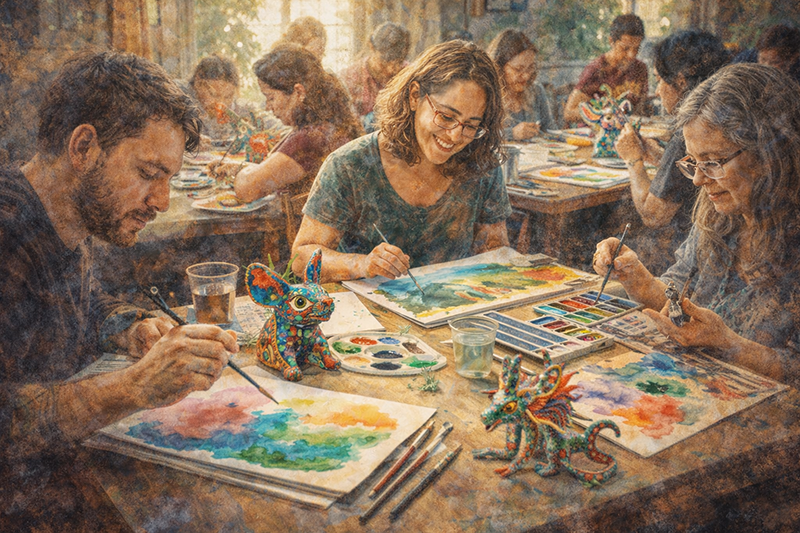 Los alebrijes y las acuarelas siguen su camino, como también lo hace el propio proceso de cada uno. Y mientras se crea, mientras se mezclan colores o se da forma con las manos, algo dentro también se acomoda, se relaja, respira. Es como si, por un momento, el ruido bajara… y apareciera ese espacio en el que simplemente se puede estar, disfrutar, y recargar energía para seguir.